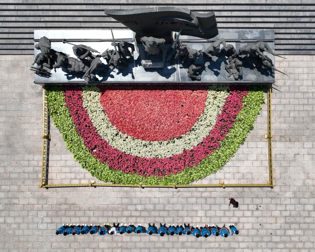 7月27日,河北省柏乡县职业技术教育中心学生在中国人民抗日军政大学陈列馆前学习(无人机照片)。新华社发(陈雷 摄)