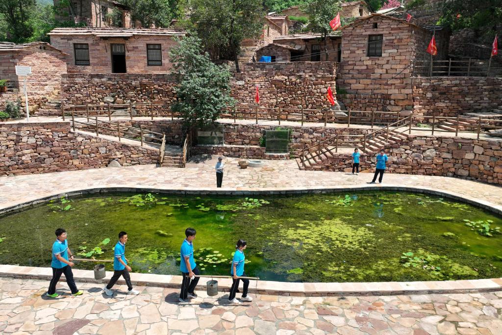 7月27日,河北省柏乡县职业技术教育中心学生在抗大旧址村邢台市信都区寨上村体验抬水(无人机照片)。新华社(陈雷 摄)