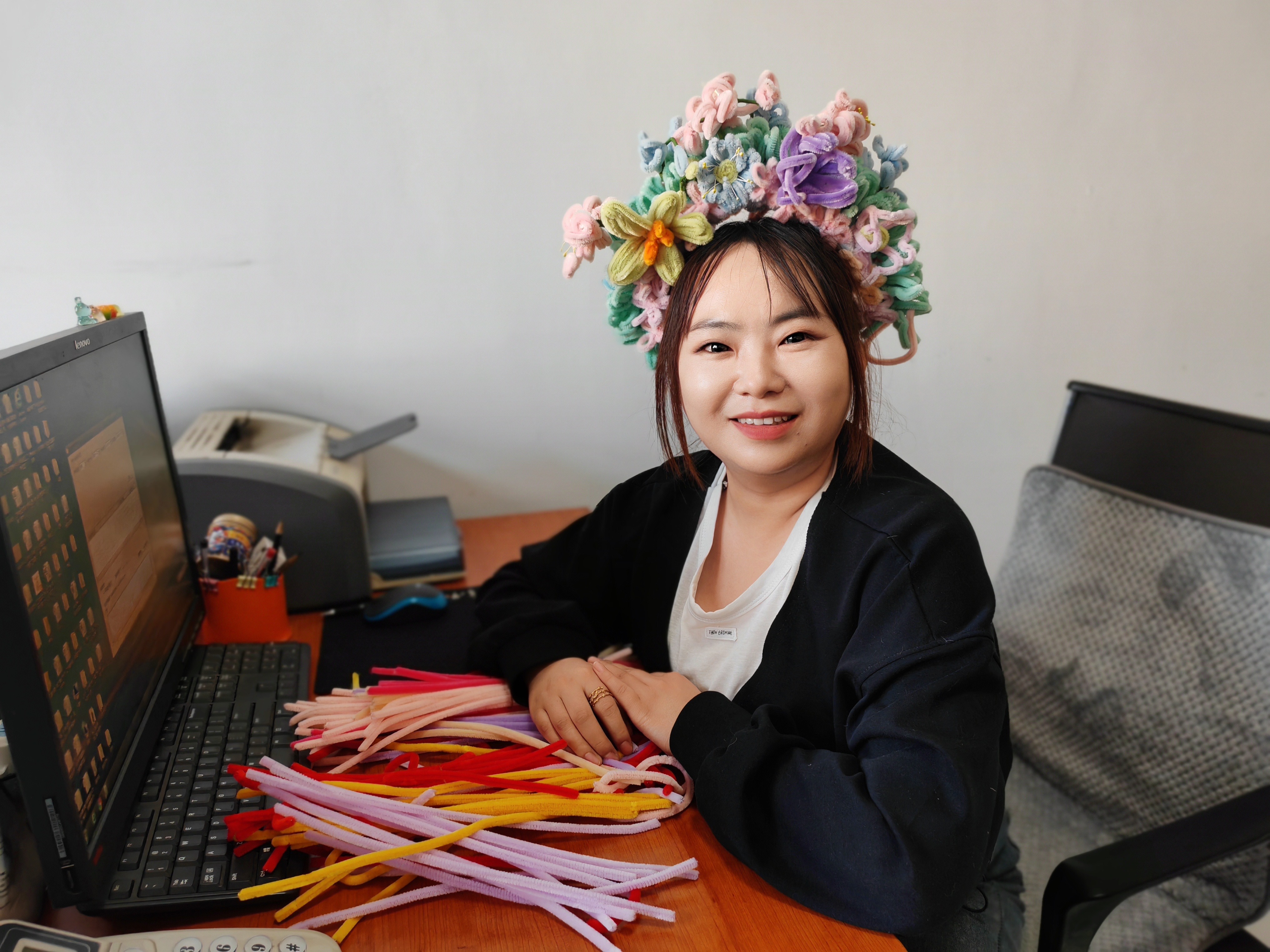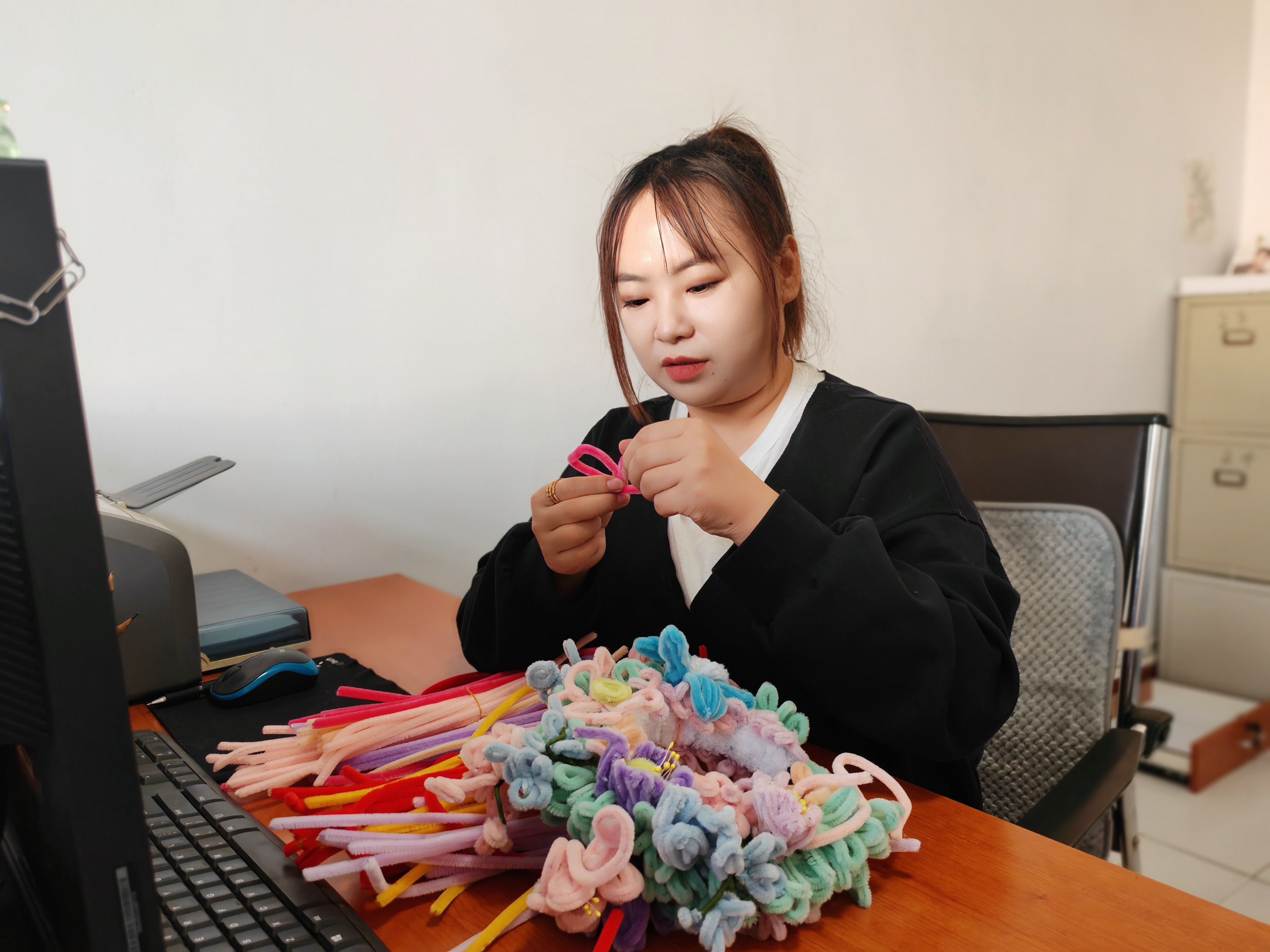 作为综合事务员,她每天对接多部门需求、梳理繁杂物资清单,一点疏漏就可能影响工作节奏——这和簪花创作如出一辙:扭棒绕圈偏半分,花瓣便会失了灵气。手工练就的“细节敏感”,让她处理工作游刃有余:整理会议资料时,凭对“秩序”的把控快速梳理琐碎信息;填报报表时,也带着做簪花般的严谨。如今,她正用扭扭棒织就双重风景——报表字里行间藏着簪花的春日浪漫,彩棒褶皱中裹着工作的细致周到。
