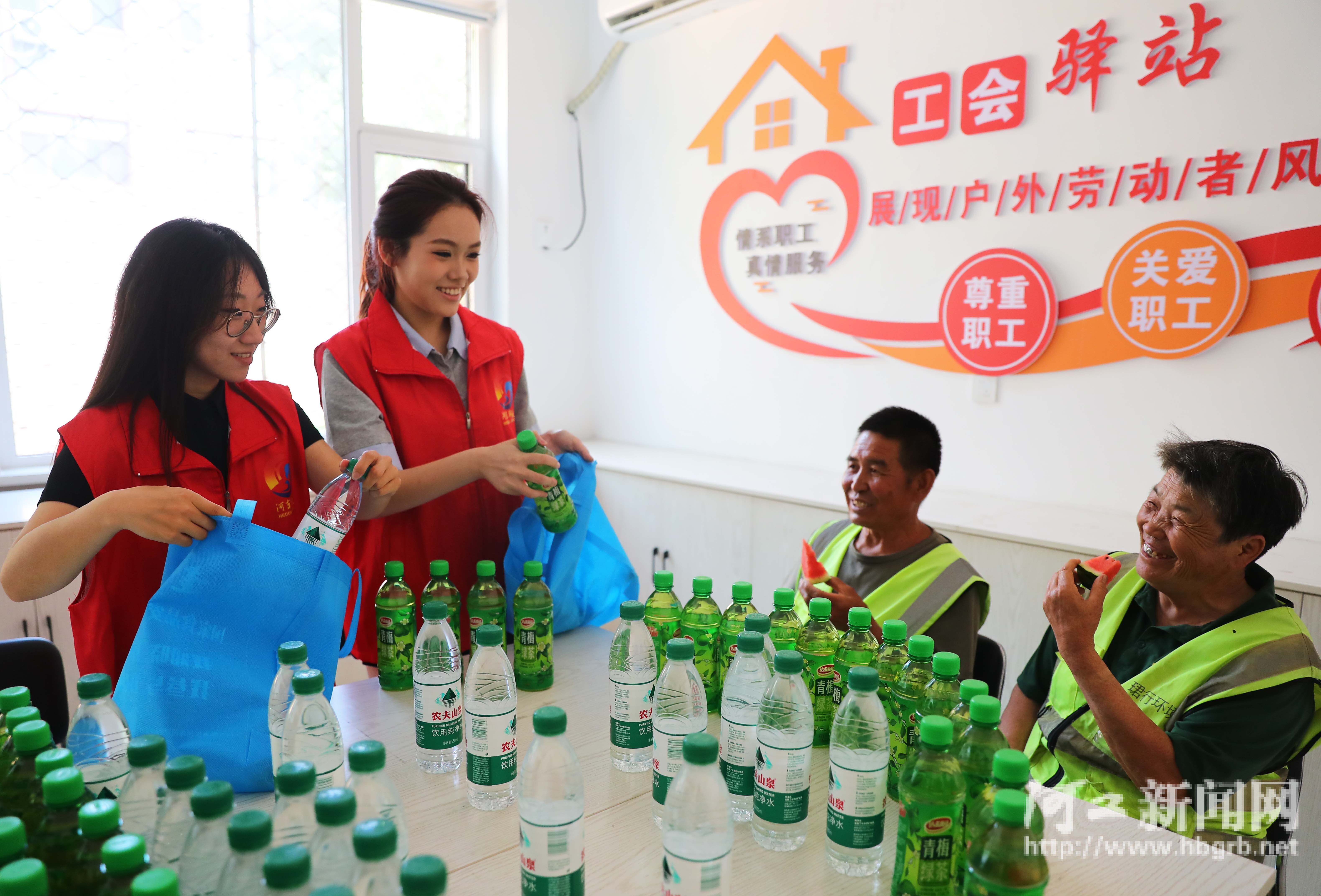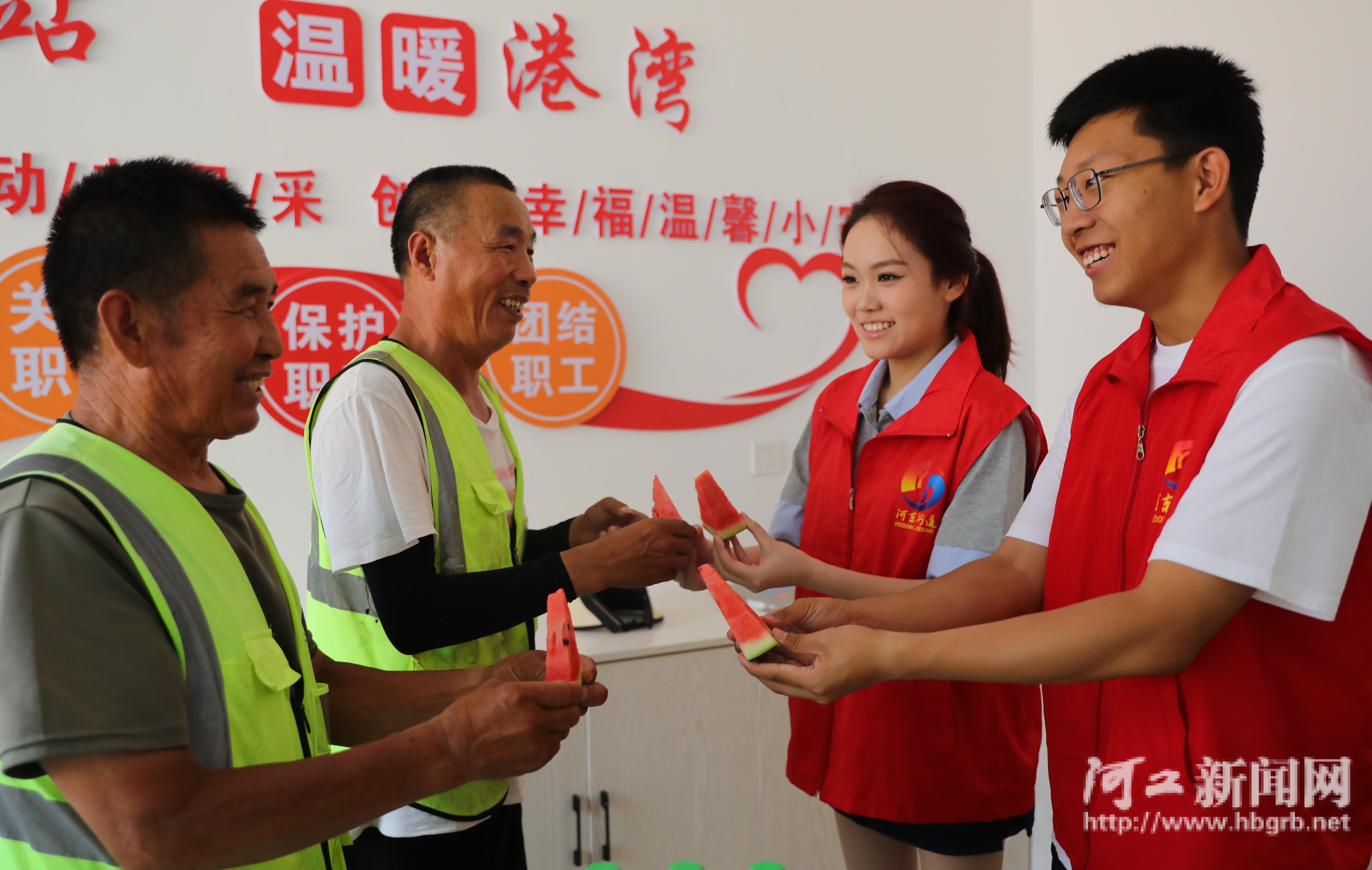7月2日,在秦皇岛市海港区工人北里社区工会驿站,志愿者为环卫工人送上西瓜、矿泉水、遮阳帽、水杯等防暑降温物品,为户外劳动者送上一份实实在在的“清凉”,在酷暑中传递工会组织的关爱。