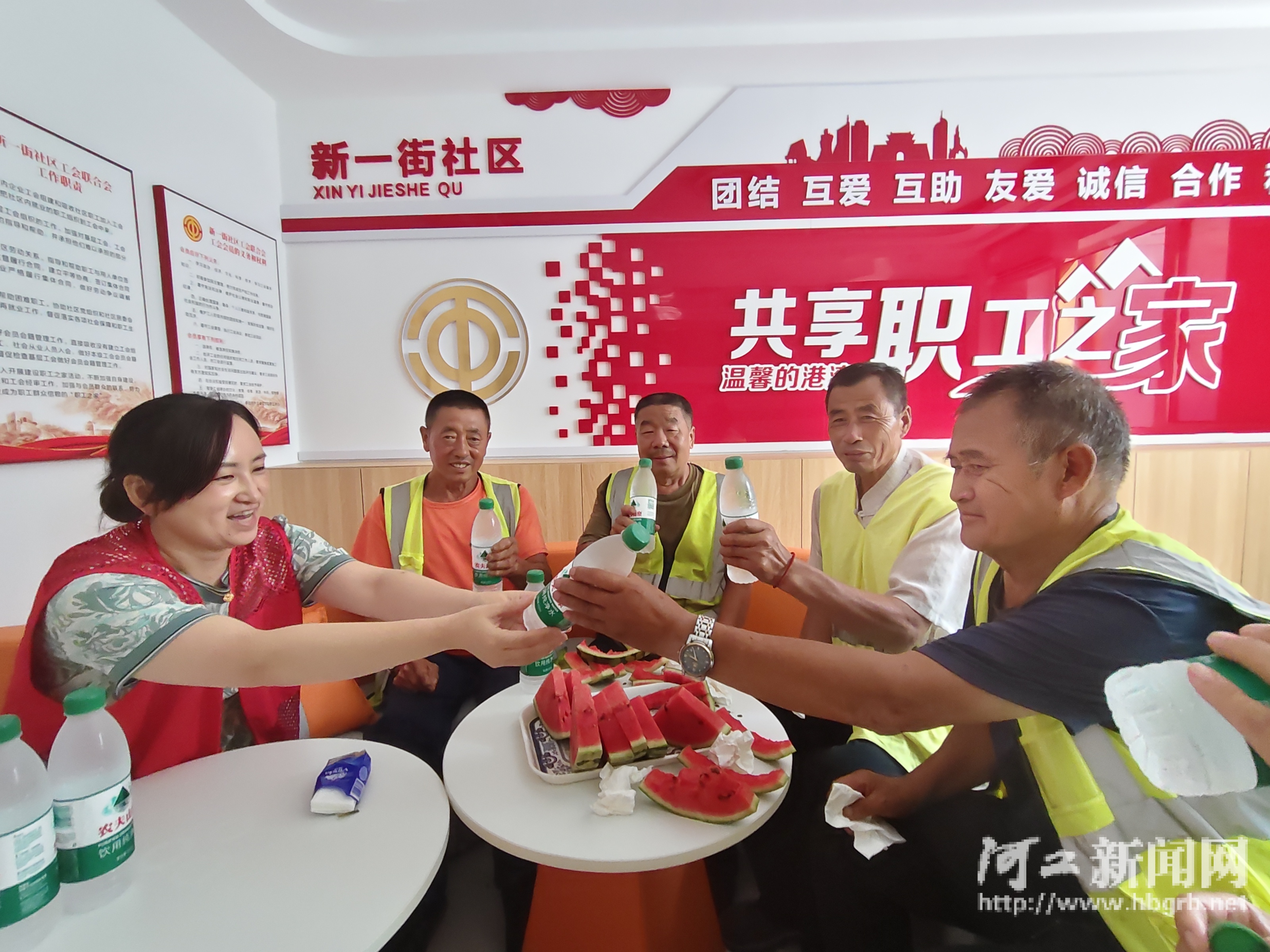 在新一街社区共享职工之家的清凉补给站内,冰镇饮用水、切块西瓜等防暑物资整齐摆放,供环卫工人随时取用。“天气炎热,清扫不一会儿就汗流浃背。这里的西瓜清凉甘甜,休息时喝口水、吃块瓜,疲惫顿时缓解不少。”刚结束清扫作业的环卫工人王师傅接过工作人员递来的西瓜,脸上洋溢着笑容。
