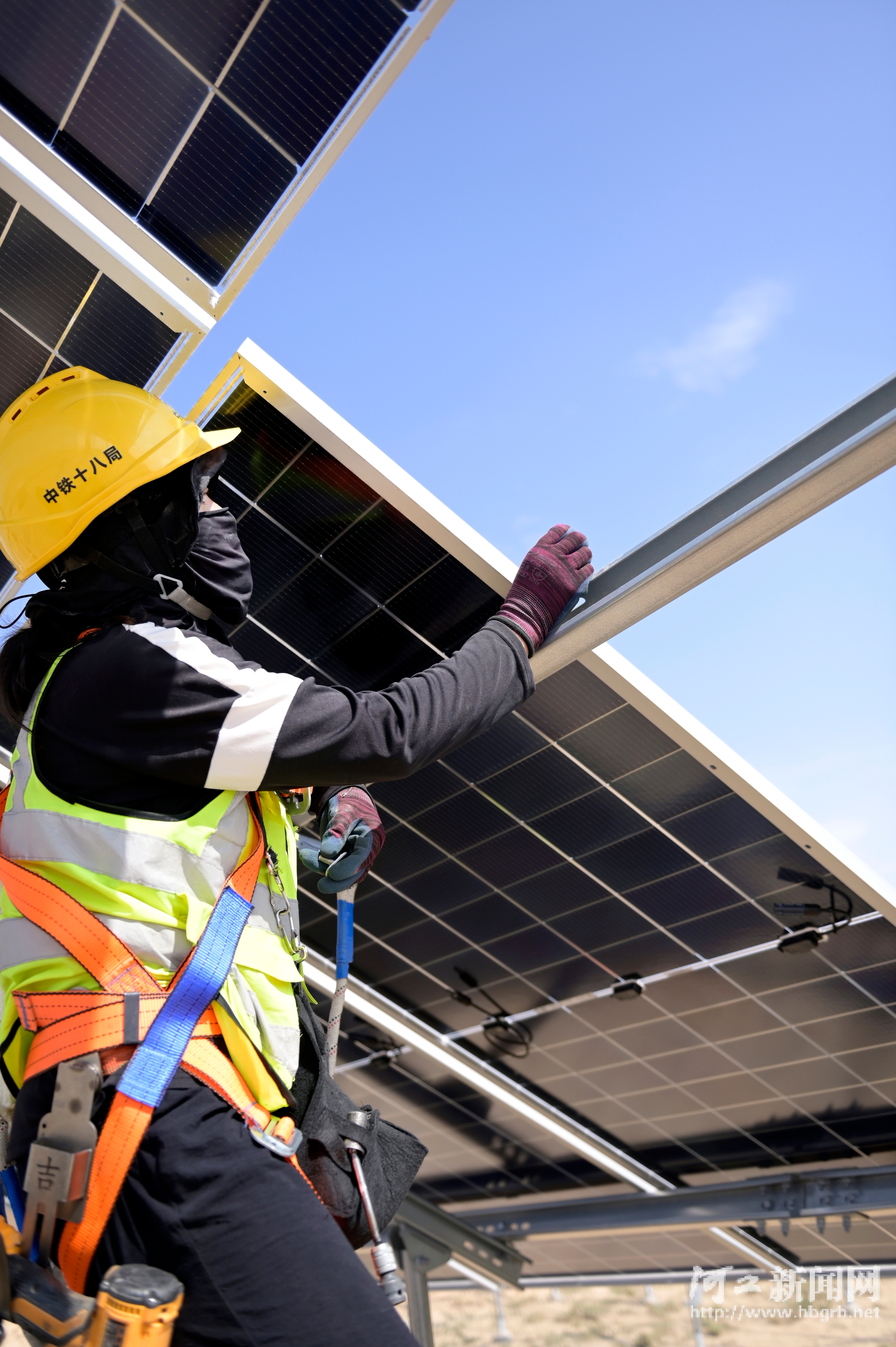 午后的阳光愈发毒辣,光伏板在强光下泛着刺眼的白光。高彦军和工友们的工装湿了又干,干了又湿,上面结出一层淡淡的盐霜。他们的吆喝声、组件的安装声在烈日下交织,成了这片荒原上最动人的旋律。
