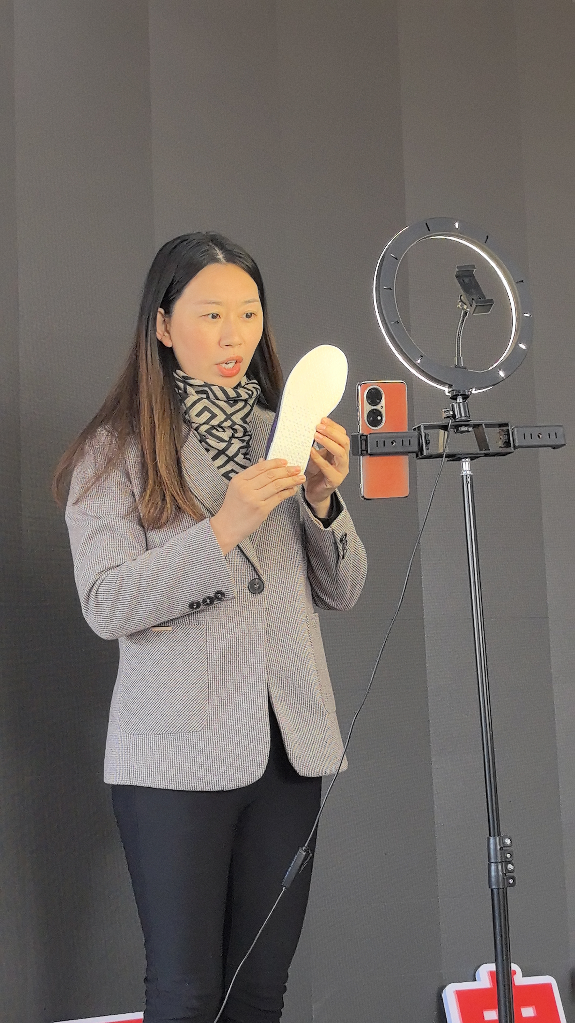 王亚梅正在进行直播带货,推广北庄村的千层底布鞋。