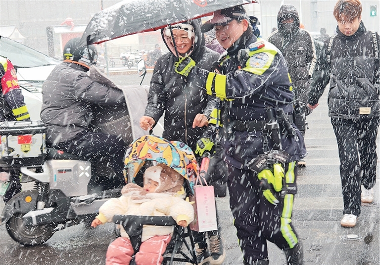 12月12日,石家庄迎来今冬第一场降雪,交警冒雪在路口执勤,保障交通顺畅;环卫工人在路上清扫积雪,为人们的出行提供便利。同日,石家庄南站也启动了降雪应急预案,领导班子成员、各专业骨干等57人全部到岗到位,分别下沉到14个车间、中间站组织除雪保畅通工作。国网石家庄供电公司提前开展电网设备特巡,采用“无人机+在线监测+可视化监控+人工”立体化巡检模式,重点对12座雨凇覆冰重点变电站、66条雨凇覆冰重点线路及煤改电重点设备开展持续盯防,及时处置各类隐患。