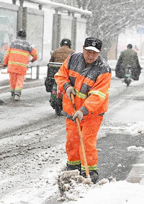 环卫工人清扫石家庄市中华大街道路上的积雪
