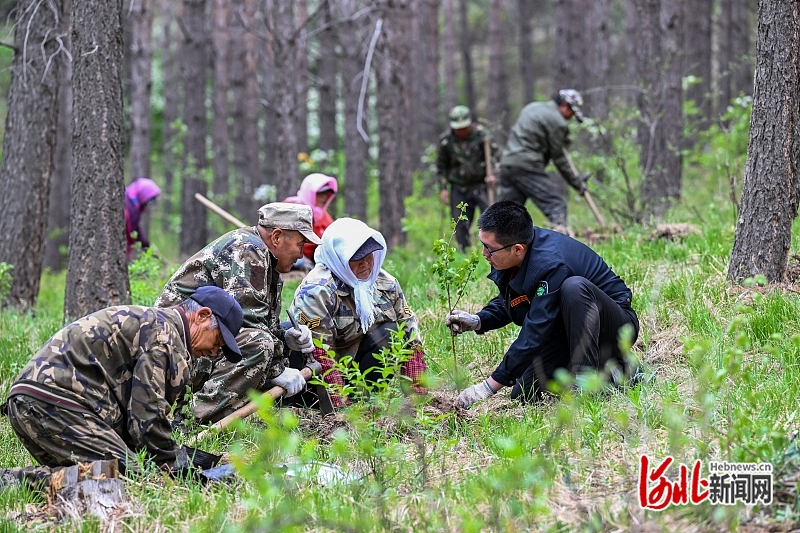 2024年5月23日,塞罕坝机械林场技术员唐超(前排右一)在指导附近村民栽植树苗。(河北日报资料片)河北日报记者田明摄
