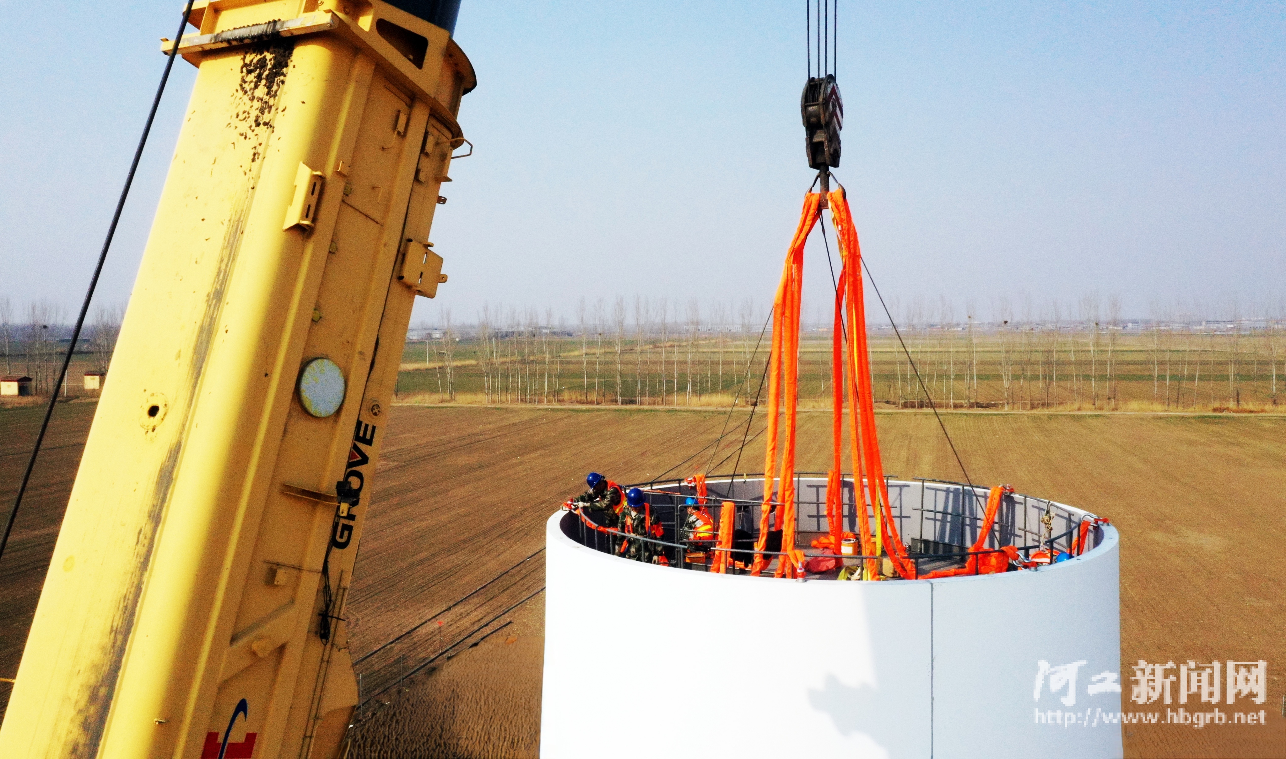 3月20日,华北油田任丘15万千瓦风电项目施工现场机械轰鸣,施工人员正在六号机位吊装风机塔筒作业。