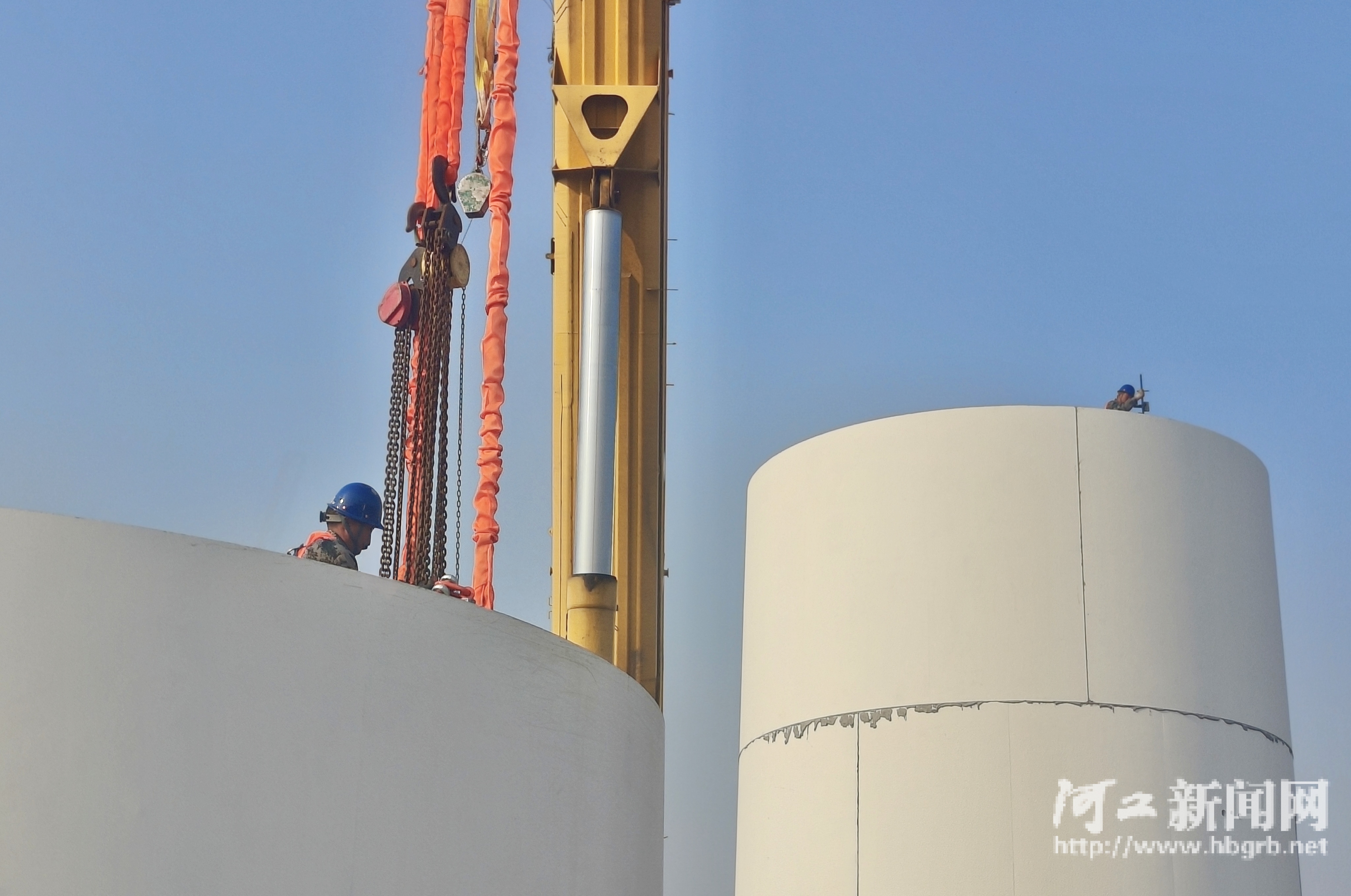 施工人员相互配合调整塔筒位置。