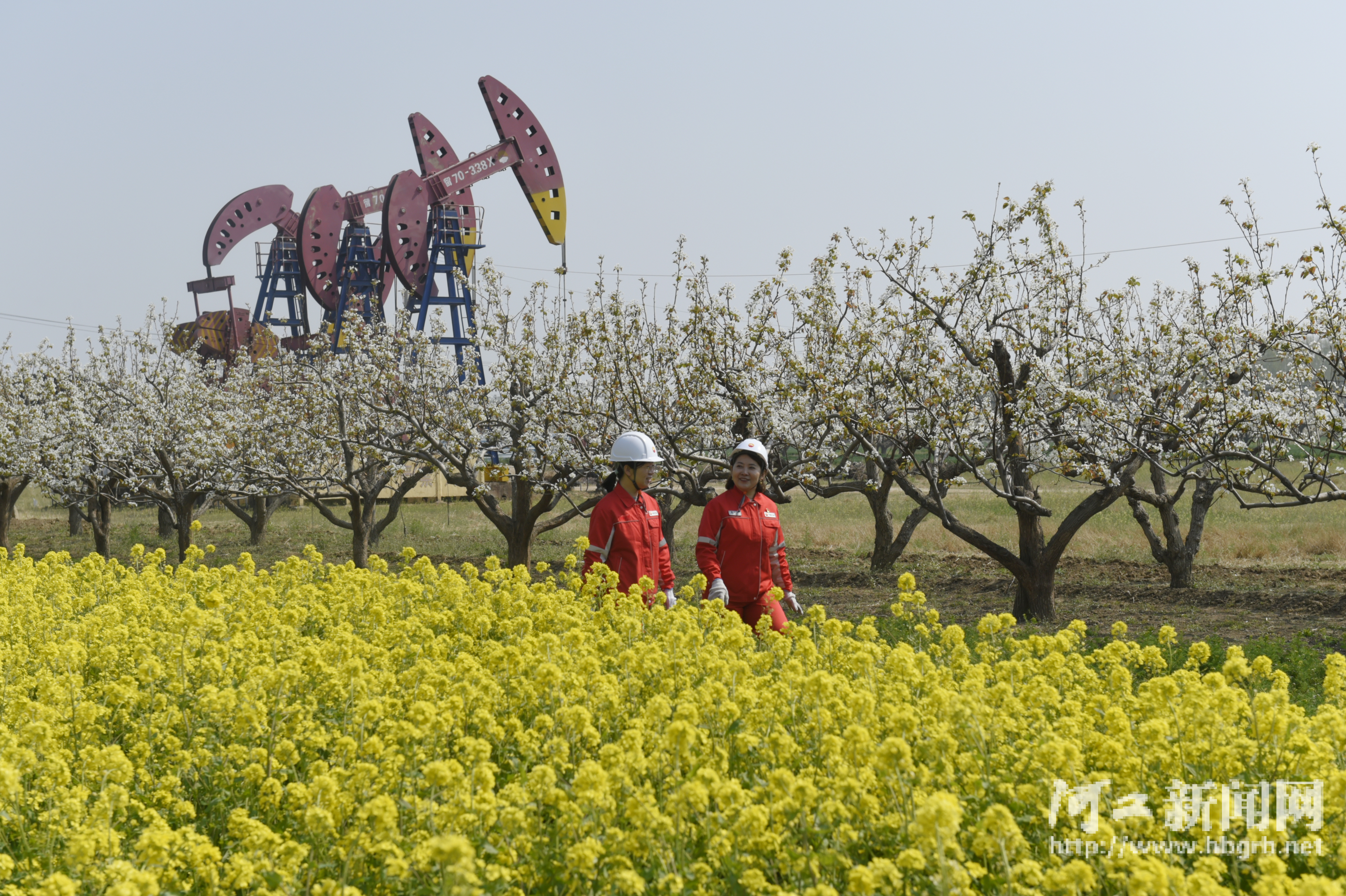 4月9日,中国石油华北油田采油三厂的油区内,桃花灼灼、梨花似雪,金黄的油菜花与初涌的麦浪交相辉映,抽油机在花海间往复运转,钻井平台矗立在春光里,勾勒出一幅幅“井在花中、人在景中”的生态油田画卷。