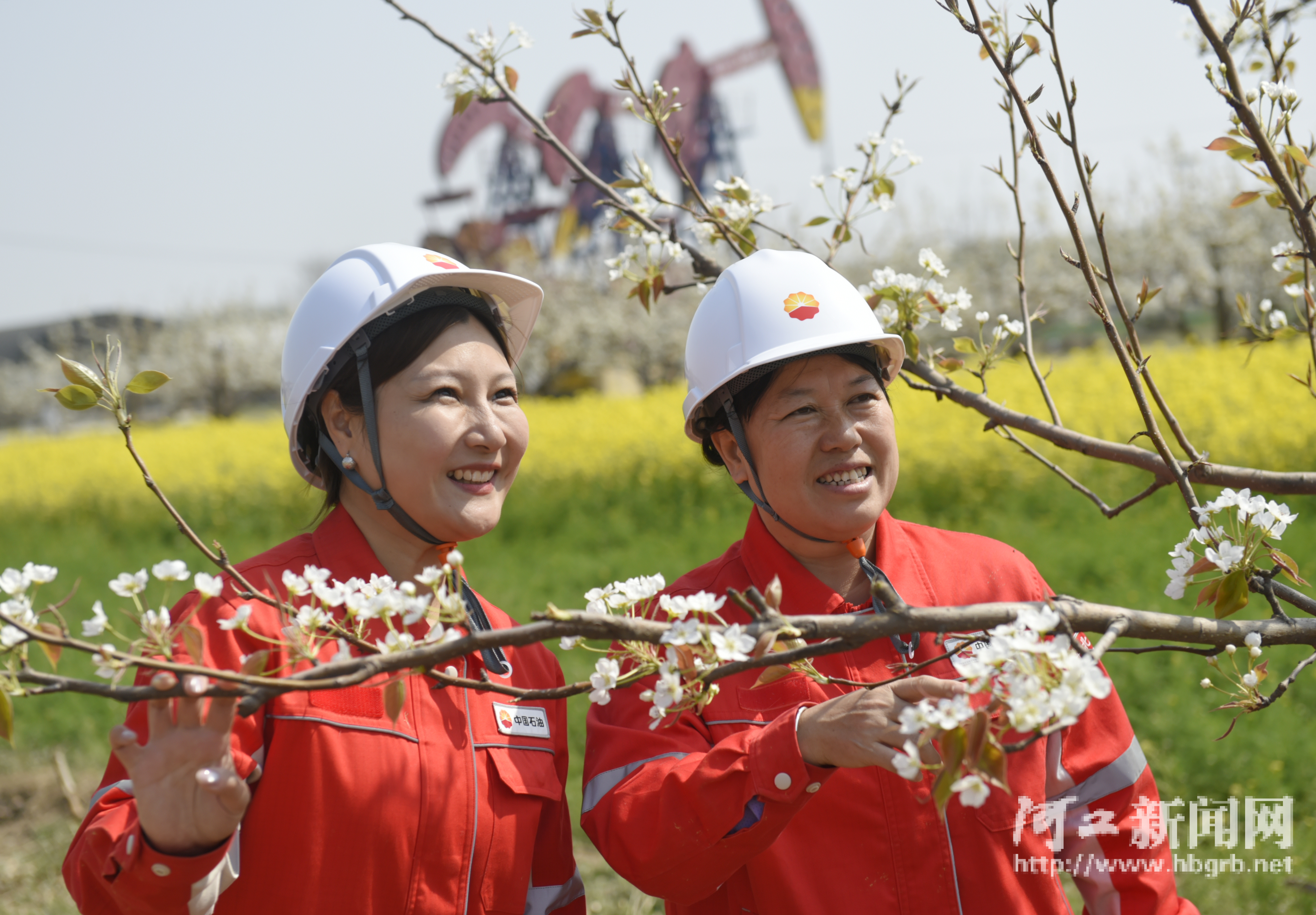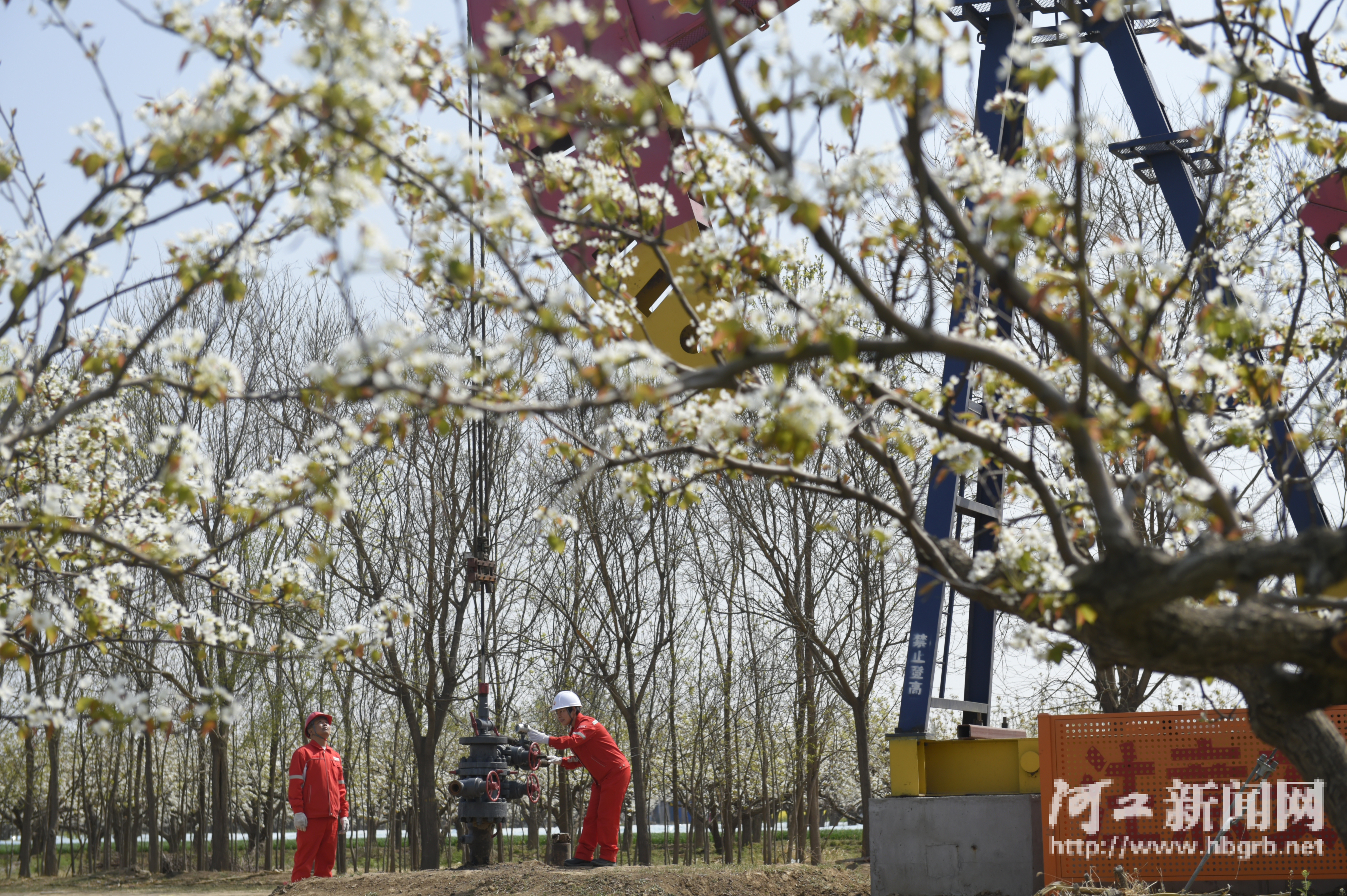 4月9日,中国石油华北油田采油三厂油区,梨花映井场,巡检保稳产。