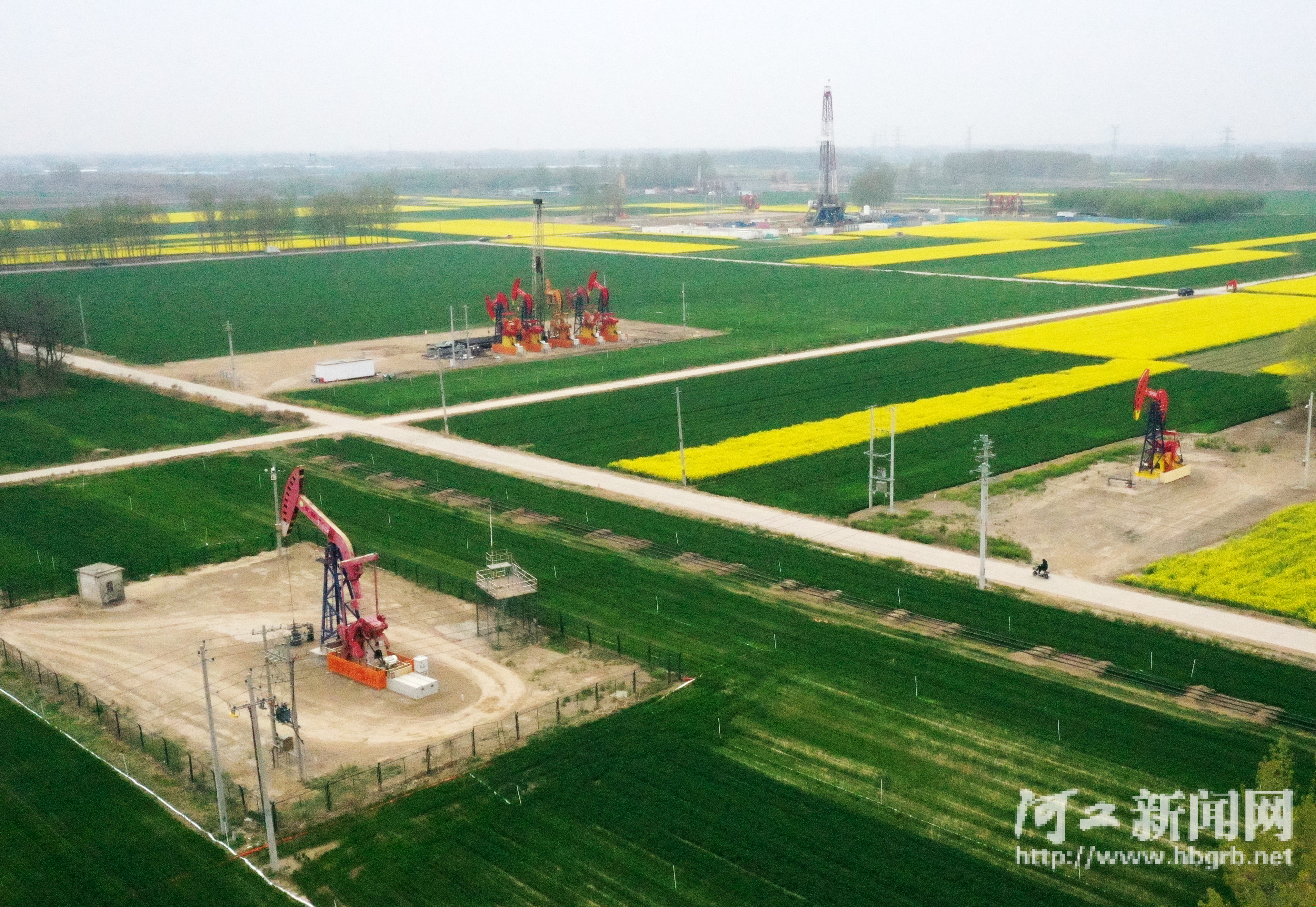 4月9日,中国石油华北油田冀中平原油区,能源保供与田园生机交相辉映。