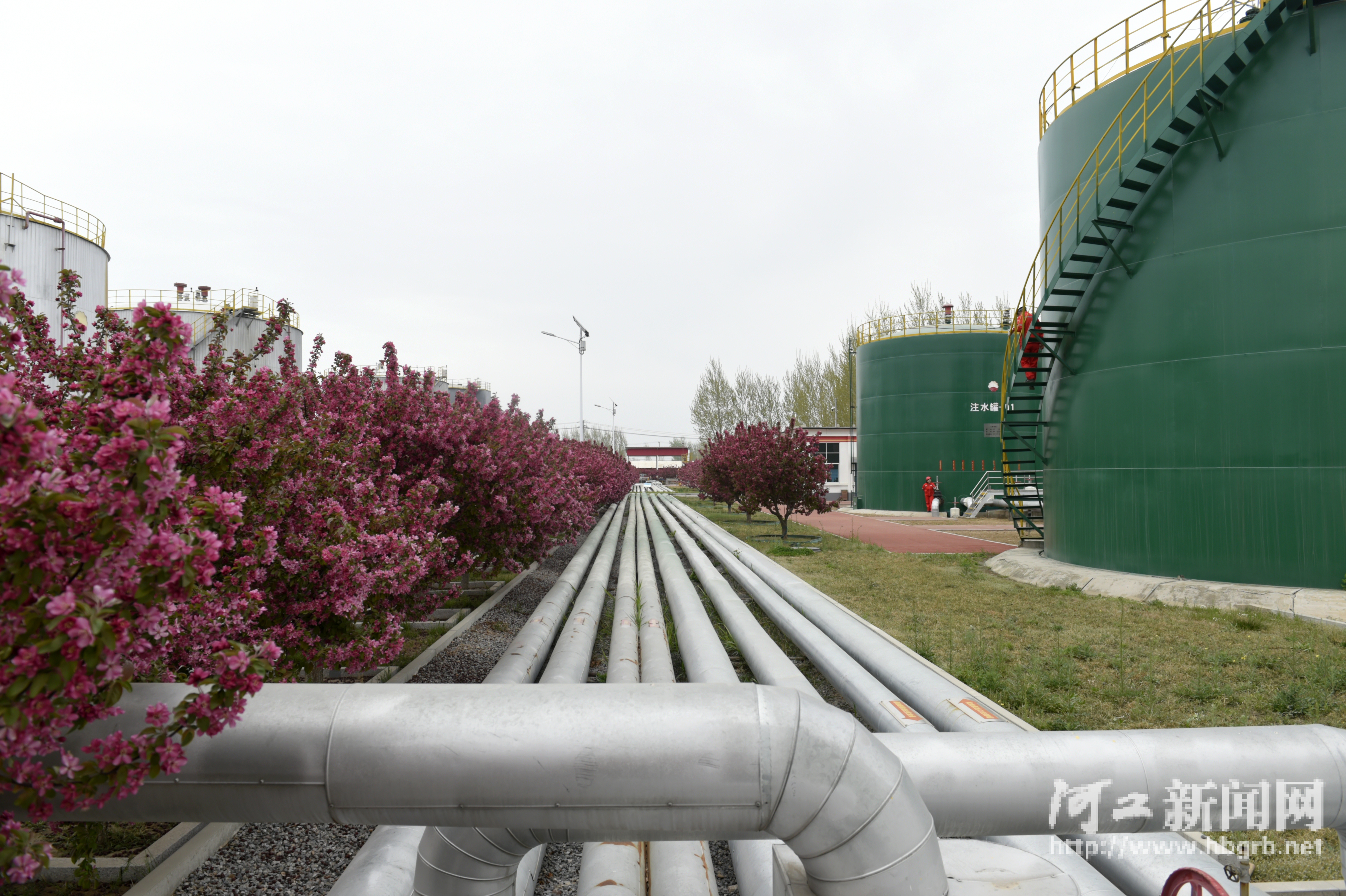 4月9日,中国石油华北油田采油三厂油区,花园式站库春意浓,员工坚守岗位保输油。