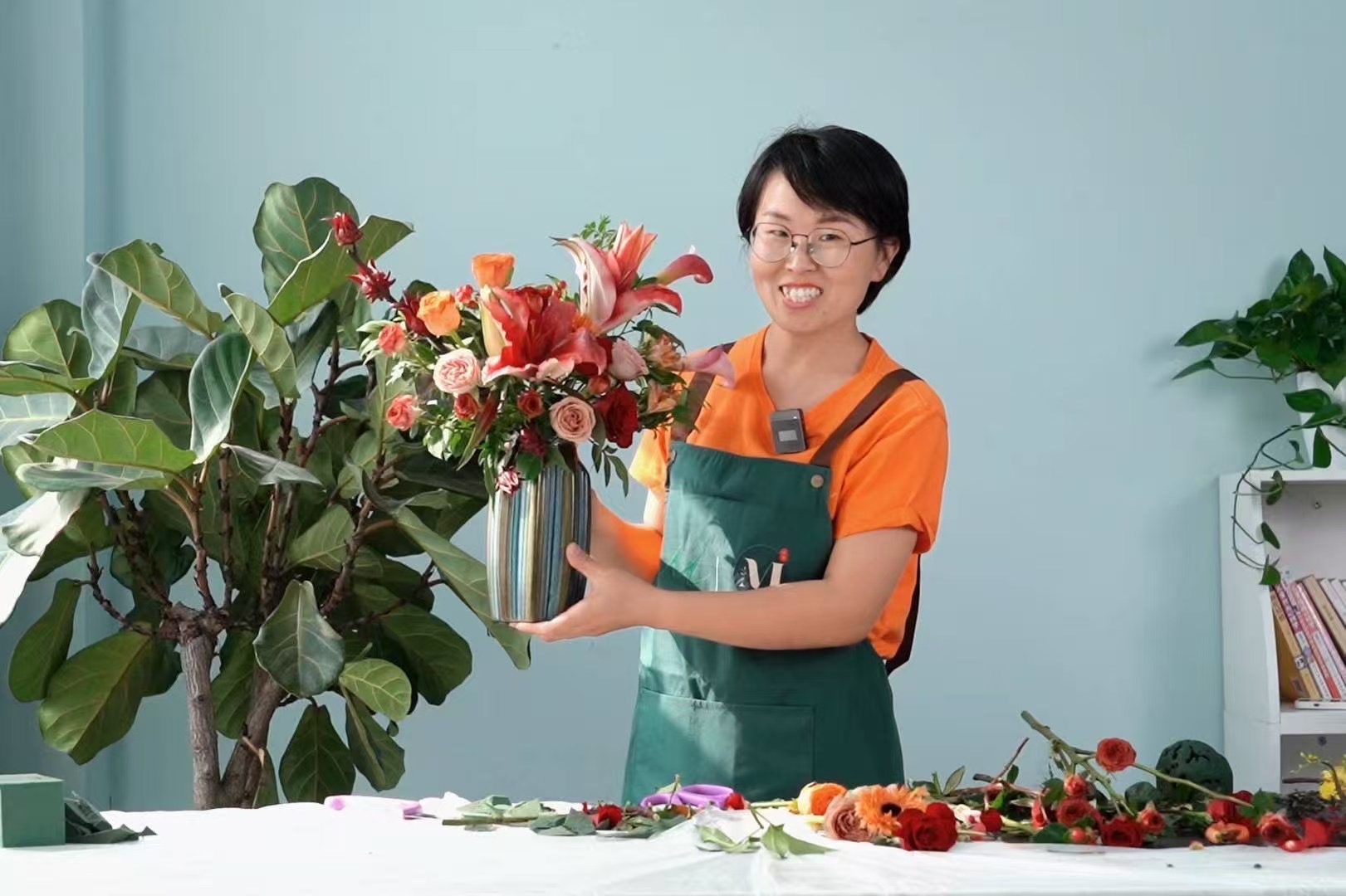 李军田展示自己的插花成果