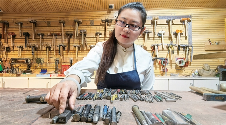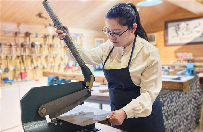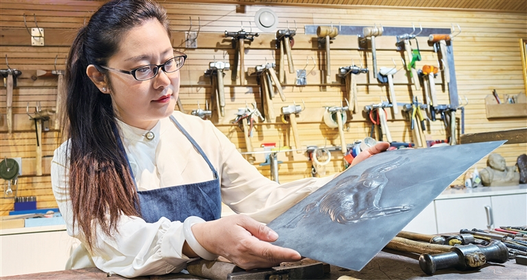 她至今记得,奶奶曾为圆父亲的艺术梦,特意腾出6平方米小屋作工作室。为减少敲击声对邻居的干扰,房门蒙了厚棉被,墙面也加装了隔音内衬。小屋夏热冬寒,堆满工具的货架更显局促,可父亲弯腰埋头创作的模样,她始终记忆犹新。而这间简陋工作室,也是她的童年乐园——伴着朝夕入耳的锤錾声,各类錾刻工具成了她的“玩具”,铁锤与铁板就此悄然融入她的生命轨迹。