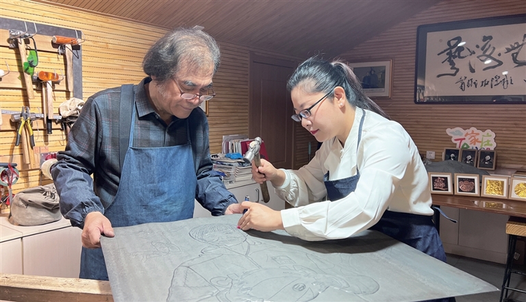 郭墨涵在与父亲郭海博(中国工艺美术大师)一起研究铁板浮雕技艺
