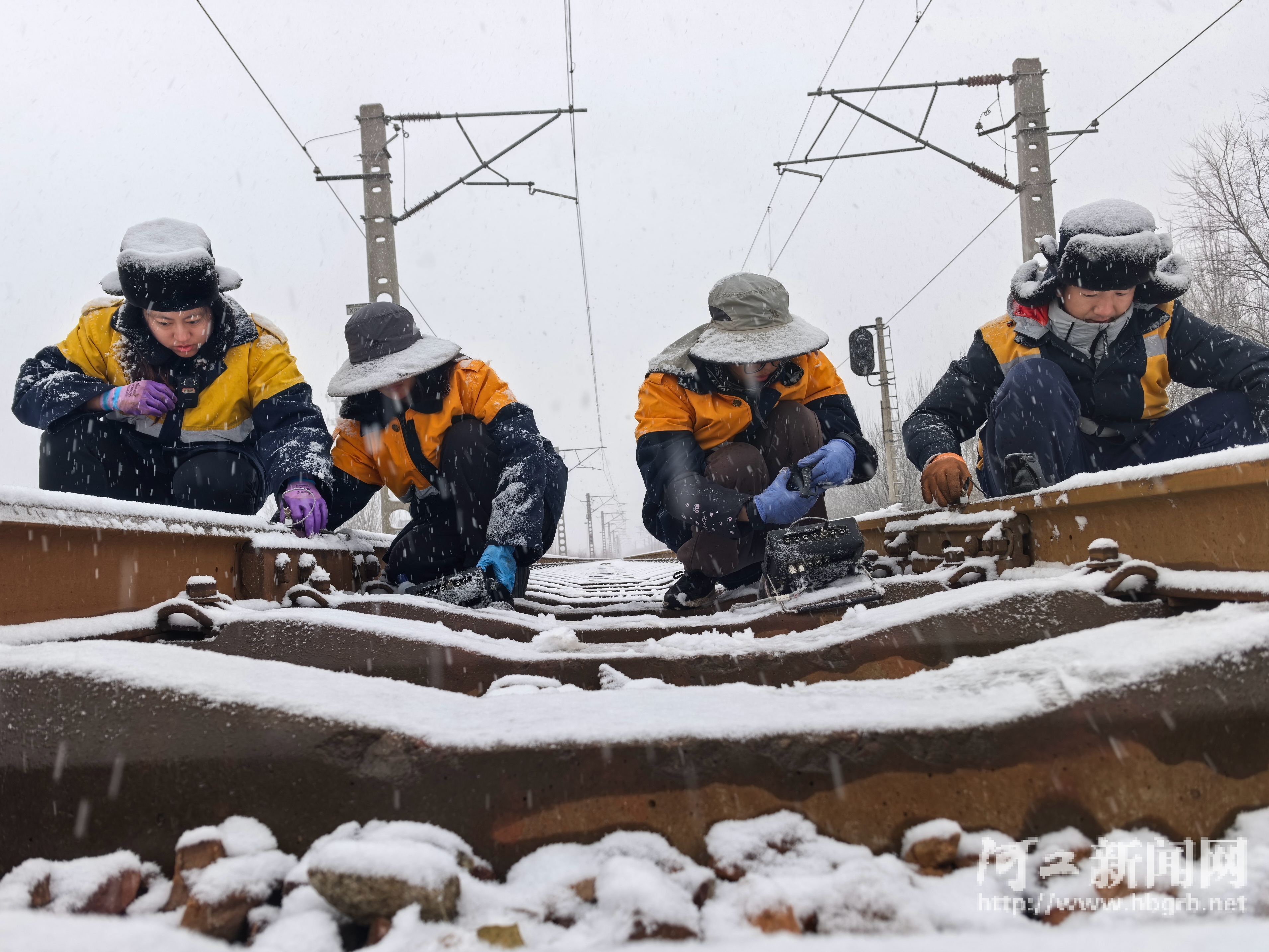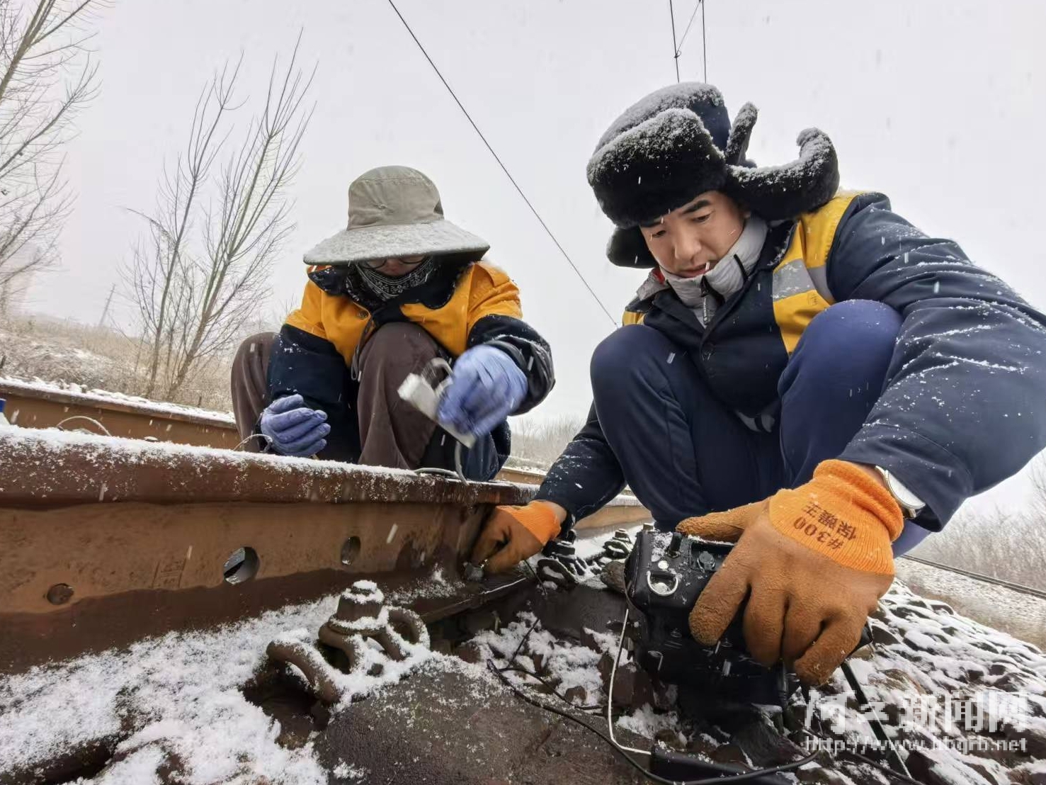 石家庄工务段职工对管内线路进行除雪巡检作业,确保铁路行车安全畅通。