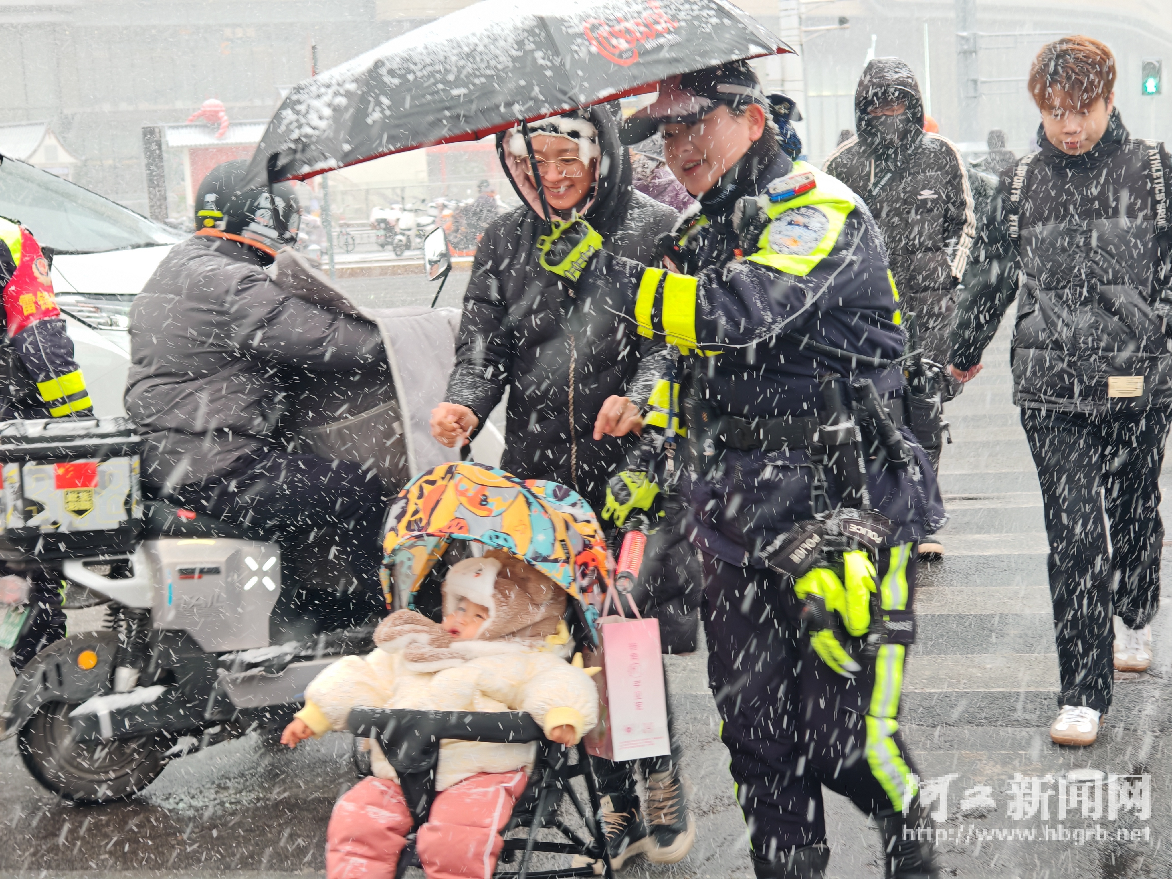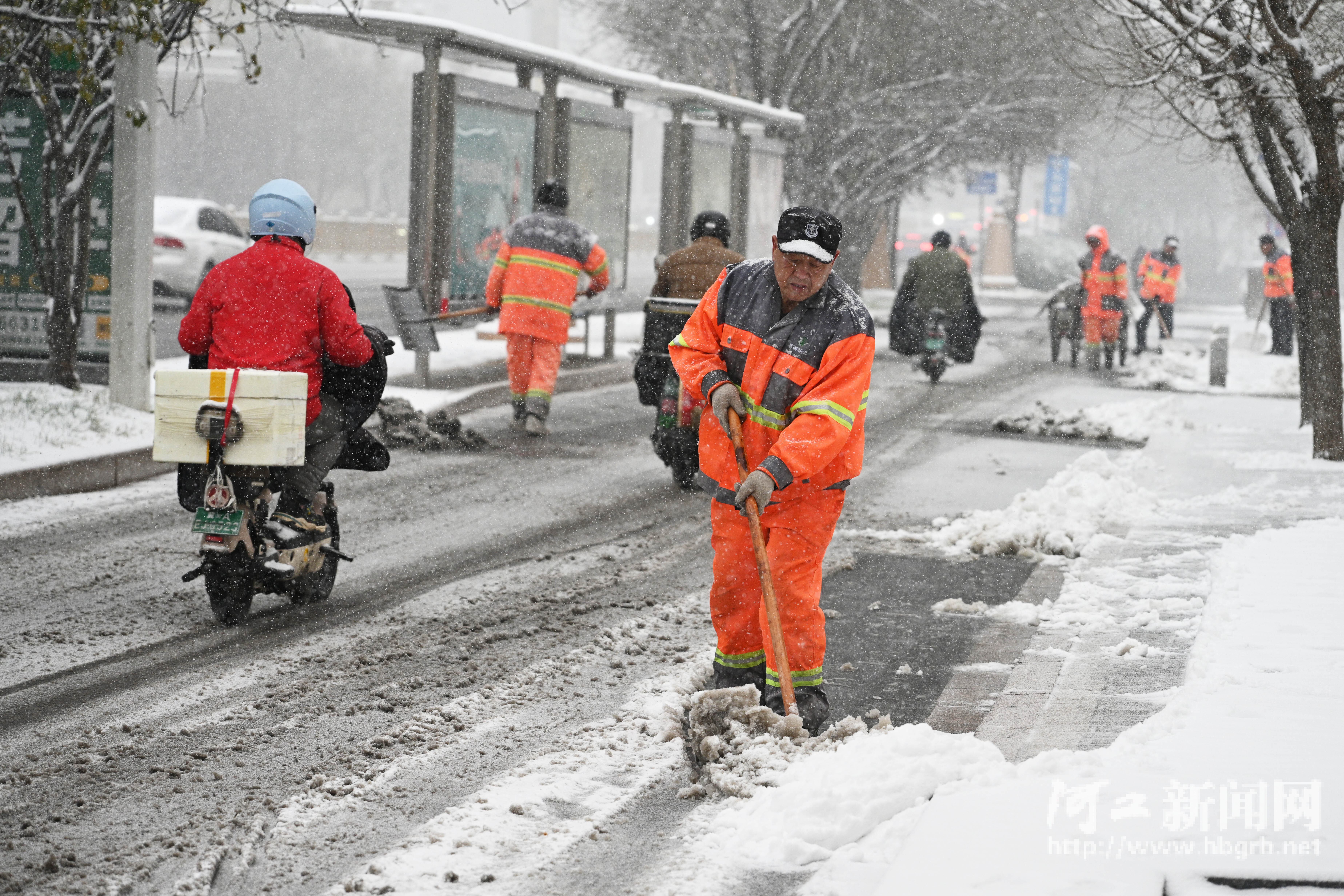 12月12日,石家庄迎来今冬第一场降雪,交警冒雪在路口执勤,保障交通顺畅;环卫工人在路上清扫积雪,为人们的出行提供便利,致敬每一个忙碌的身影。
